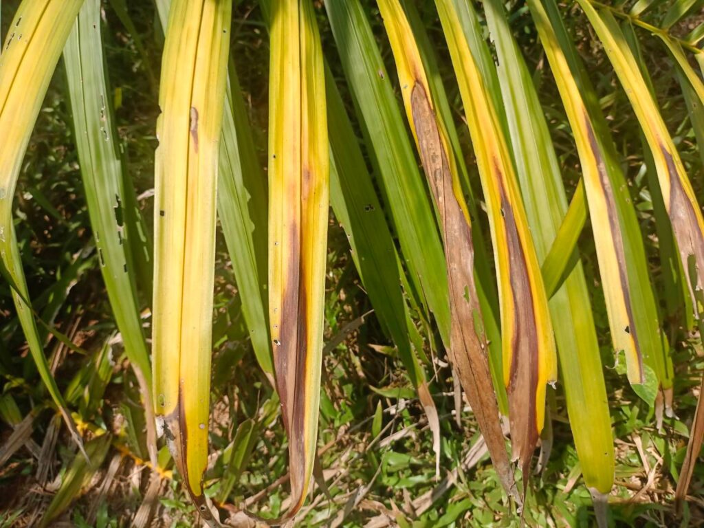 จากการลงพื้นที่ และสอบถามเกษตรกร พบว่า ที่ผ่านมาเกษตรกรมีการให้ปุ๋ยสูตร 15-15-15 และ 0-0-60 มาตลอด ซึ่งไม่สอดคล้องกับช่วงการเจริญเติบโตของต้นปาล์มในช่วงปาล์มเล็ก ซึ่งต้องการ N สูง จึงส่งผลให้ต้นปาล์มน้ำมันแสดงอาการขาดธาตุ N ซึ่งมีอาการใบเหลืองจากใบล่าง และไหม้จากปลายใบ ซึ่งเป็นอาการของการขาดธาตุ N ได้มีคำแนะนำให้เกษตรกรให้ปุ๋ยสูตรที่มี N สูง เช่น 25-7-7 หรือ 18-8-8 ในช่วงที่ดินมีความชื้น
