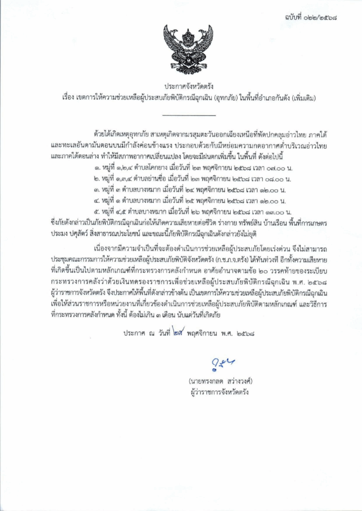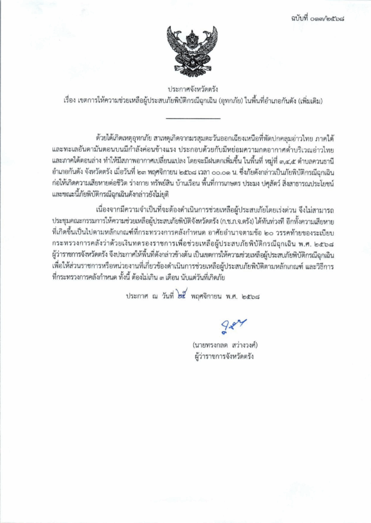 ตามระเบียบกระทรวงการคลังว่าด้วยเงินทดรองราชการเพื่อช่วยเหลือผู้ประสบภัยพิบัติกรณีฉุกเฉิน พ.ศ. 2568 หลักเกณฑ์การใช้จ่ายเงินทดรองราชการเพื่อช่วยเหลือผู้ประสบภัยพิบัติ กรณีฉุกเฉิน พ.ศ. 2563 และหลักเกณฑ์วิธีปฏิบัติปลีกย่อยเกี่ยวกับการให้ความช่วยเหลือด้านการเกษตรผู้ประสบภัยพิบัติกรณีฉุกเฉิน พ.ศ. 2564 ผู้ว่าราชการจังหวัดจังหวัดตรังได้ประกาศเขตให้ความช่วยเหลือผู้ประสบภัยพิบัติกรณีฉุกเฉิน (อุทกภัย) ในเขตพื้นที่อำเภอกันตัง ได้แก่ ตำบลควนธานี หมู่ที่ 1,2,3,4,5 และ 6 ตำบลโคกยาง หมู่ที่ 1,2 และ 4 ตำบลย่านซื่อ หมู่ที่ 1,3 และ 4 และตำบลบางหมาก หมู่ที่ 1,3,4 และ 5