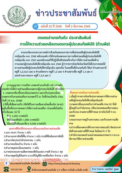 ข่าวประชาสัมพันธ์เกษตรอำเภอกันตัง ประชาสัมพันธ์ การให้ความช่วยเหลือเกษตรกรผู้ประสบภัยพิบัติ (ด้านพืช) kantang_admin / 2 ธันวาคม 2025 ตามระเบียบกระทรวงการ