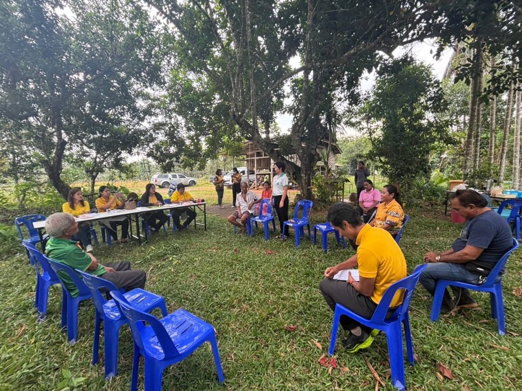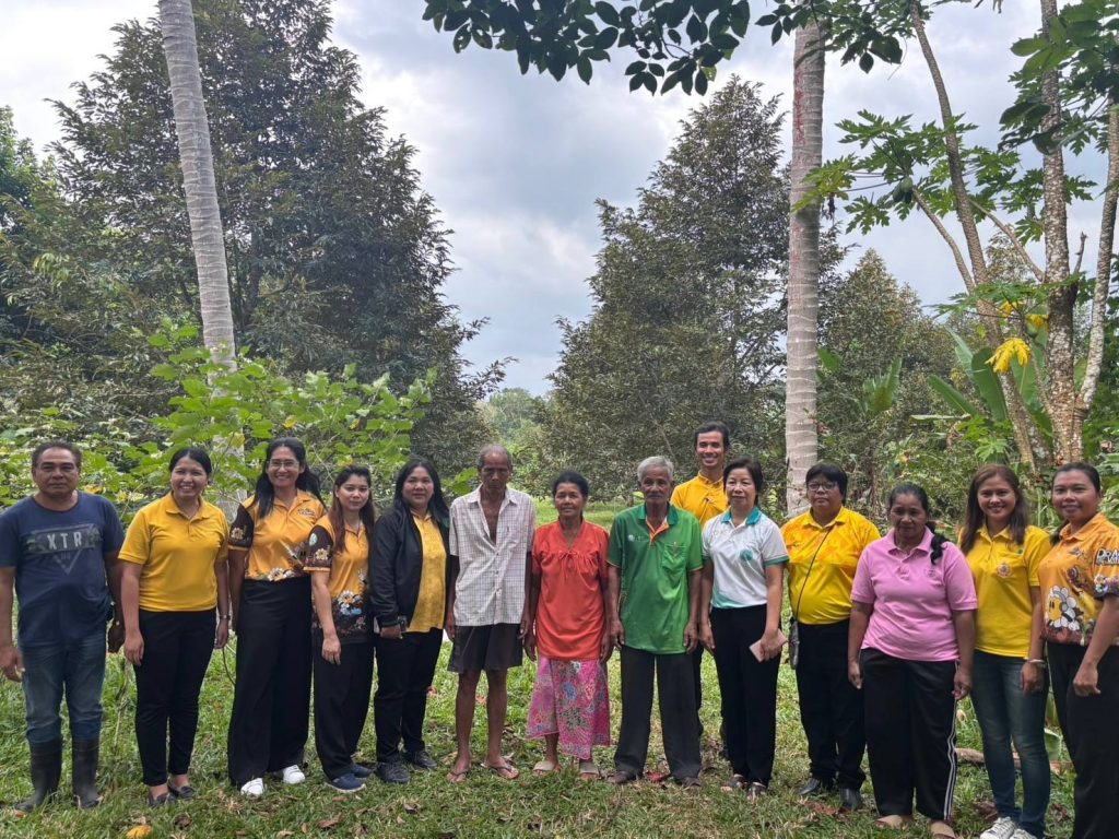 นางนิตยา จันทร์ประทีป เกษตรอำเภอเมืองตรัง และนักวิชาการส่งเสริมการเกษตร สำนักงานเกษตรอำเภอเมืองตรัง พร้อมด้วย นายสุนันท์ หลักเพ็ชร ผู้ใหญ่บ้านหมู่ที่ 9 นายจำนงค์ คงสม ผู้ช่วยผู้ใหญ่บ้านหมู่ที่ 9 ตำบลบ้านโพธิ์ อำเภอเมืองตรัง จังหวัดตรัง นายสนอง เสนี ประธานศูนย์จัดการดินปุ๋ยชุมชนตำบลบ้านโพธิ์ และนายอ่วม เสนี เกษตรกรไร่นาสวนผสม ร่วมให้การต้อนรับและนำเสนอการทำการเกษตรแบบไร่นาสวนผสม ให้ข้อมูล และตอบข้อซักถาม แนวคิดการทำการเกษตรให้กับ คณะลงพื้นที่เก็บข้อมูลฯ ณ หมู่ที่ 9 ตำบลบ้านโพธิ์ อำเภอเมืองตรัง จังหวัดตรัง