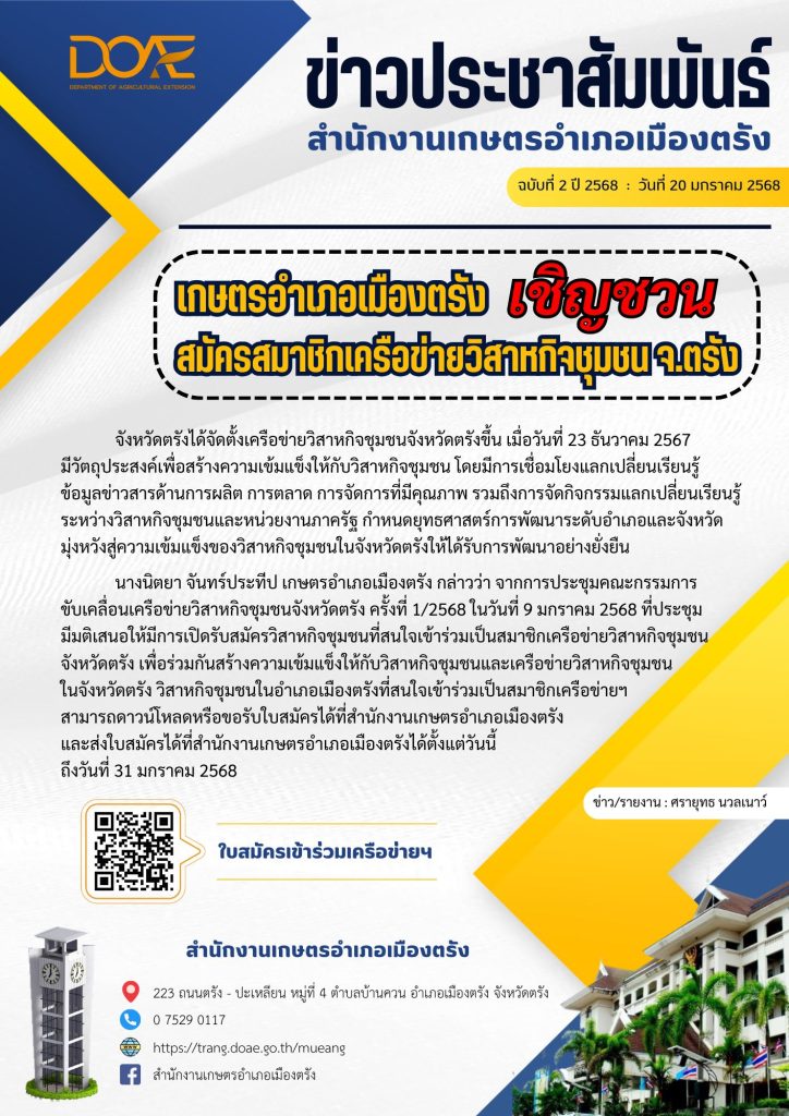 ข่าวประชาสัมพันธ์ สำนักงานเกษตรอำเภอเมืองตรัง ฉบับที่ 2 ปี 2568 วันที่ 20 มกราคม 2568