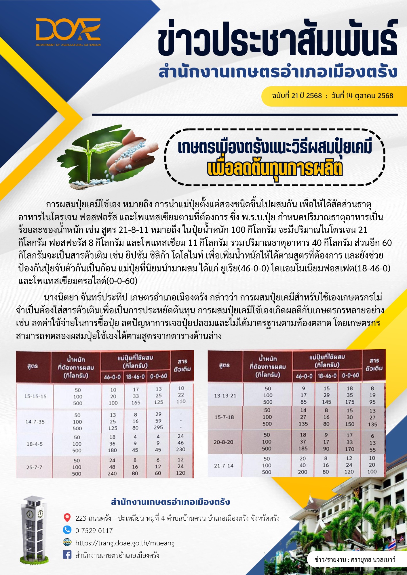 นางนิตยา จันทร์ประทีป เกษตรอำเภอเมืองตรัง กล่าวว่า การผสมปุ๋ยเคมีสำหรับใช้เองเกษตรกรไม่จำเป็นต้องใส่สารตัวเติมเพื่อเป็นการประหยัดต้นทุน การผสมปุ๋ยเคมีใช้เองเกิดผลดีกับเกษตรกรหลายอย่าง เช่น ลดค่าใช้จ่ายในการซื้อปุ๋ย ลดปัญหาการเจอปุ๋ยปลอมและไม่ได้มาตรฐานตามท้องตลาด โดยเกษตรกรสามารถทดลองผสมปุ๋ยใช้เองได้ตามสูตรจากตารางด้านล่าง