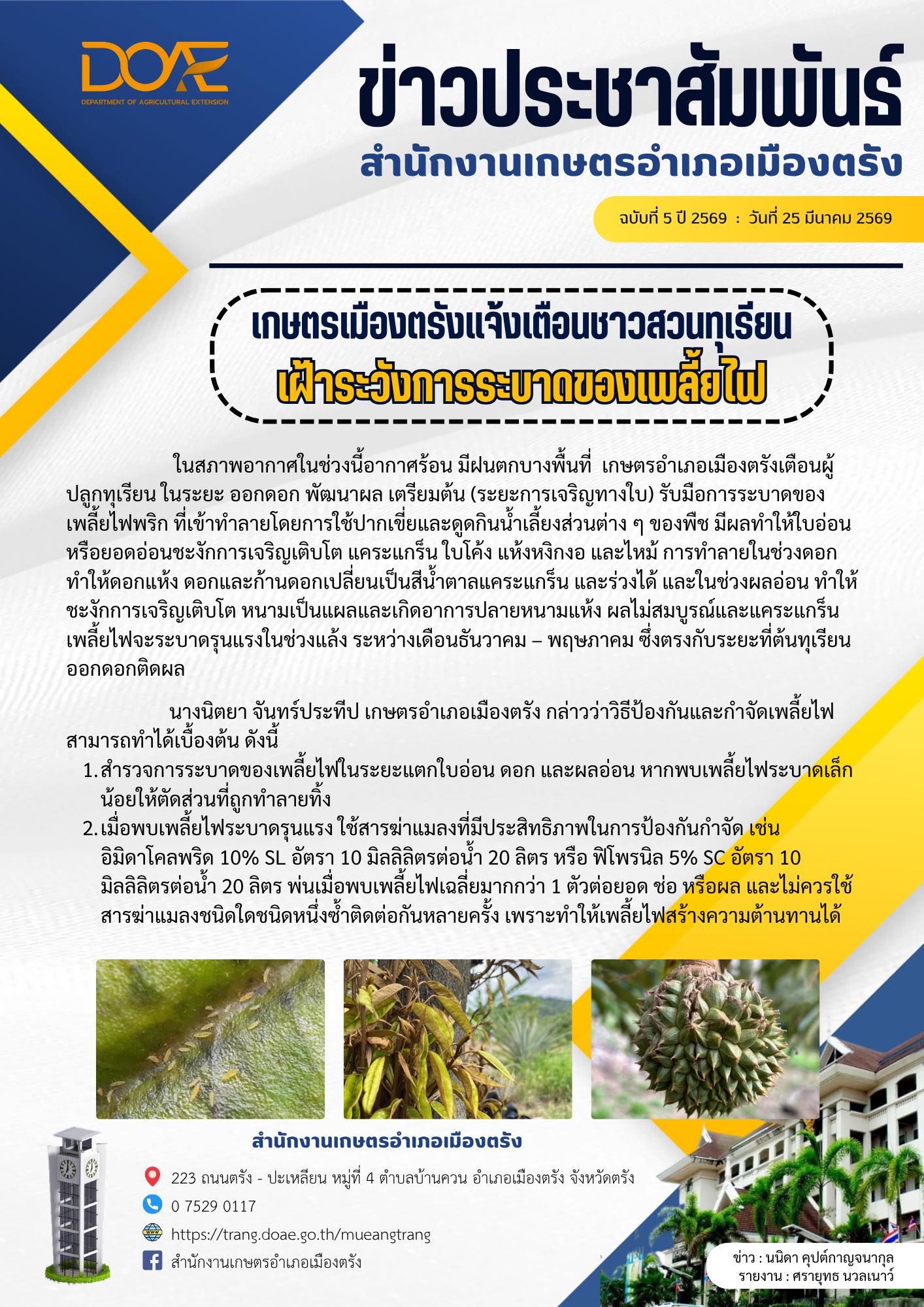 เกษตรเมืองตรัง แจ้งเตือนชาวสวนทุเรียน เฝ้าระวังการระบาดของเพลี้ยไฟ25 มีนาคม 2026mueangtrang_adminRead More