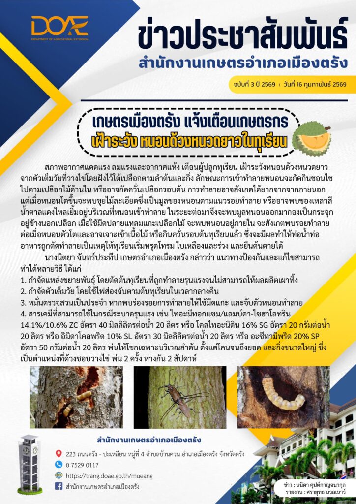 ข่าวประชาสัมพันธ์เกษตรเมืองตรัง แจ้งเตือนเกษตรกรเฝ้าระวังหนอนด้วงหนวดยาวในทุเรียน mueangtrang_admin / 16 กุมภาพันธ์ 2026 สภาพอากาศแดดแรง ลมแร