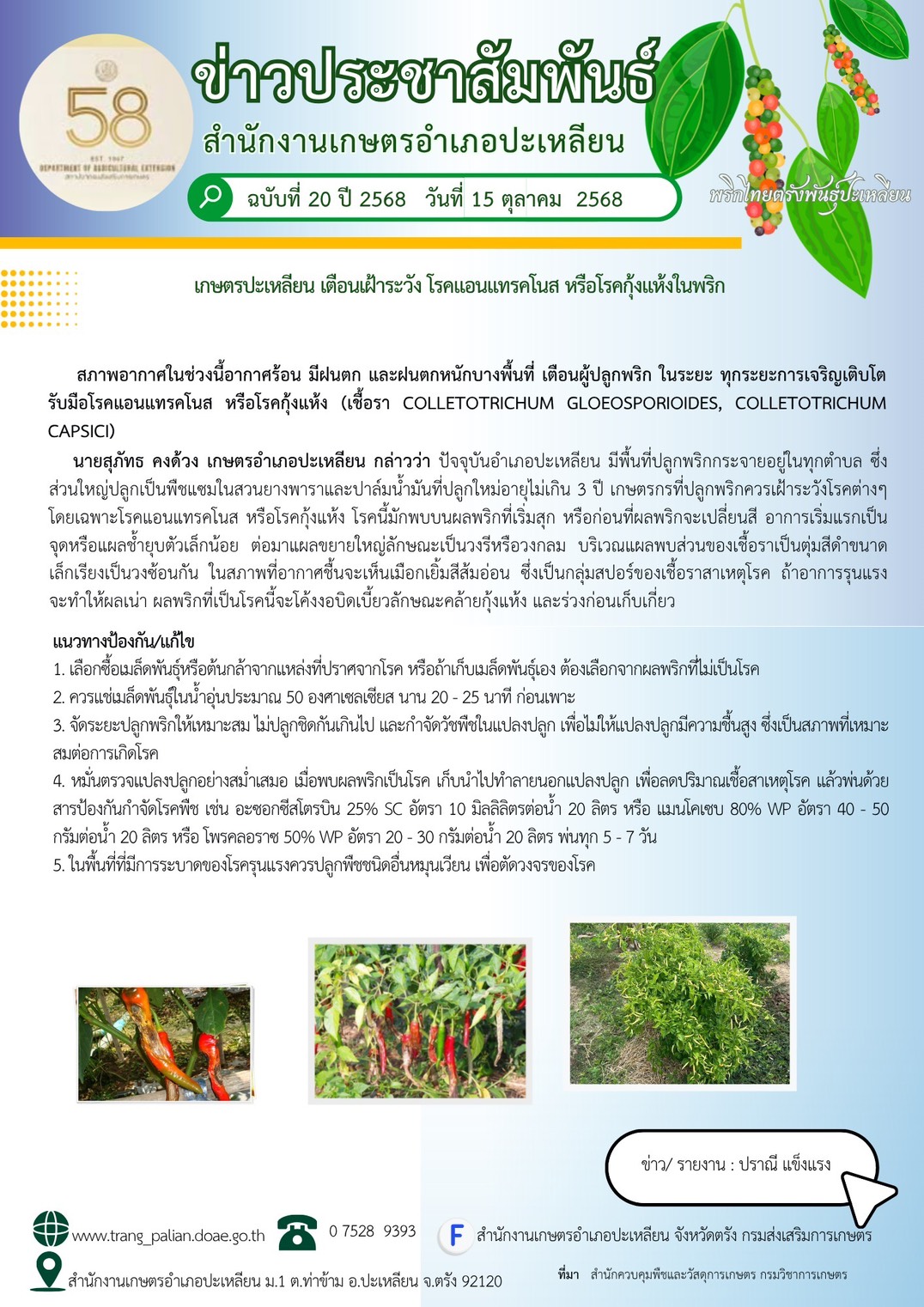 นายสุภัทธ คงด้วง เกษตรอำเภอปะเหลียน กล่าวว่า ปัจจุบันอำเภอปะเหลียน มีพื้นที่ปลูกพริกกระจายอยู่ในทุกตำบล ซึ่งส่วนใหญ่ปลูกเป็นพืชแซมในสวนยางพาราและปาล์มน้ำมันที่ปลูกใหม่อายุไม่เกิน 3 ปี เกษตรกรที่ปลูกพริกควรเฝ้าระวังโรคต่างๆ โดยเฉพาะโรคแอนแทรคโนส หรือโรคกุ้งแห้ง โรคนี้มักพบบนผลพริกที่เริ่มสุก หรือก่อนที่ผลพริกจะเปลี่ยนสี อาการเริ่มแรกเป็นจุดหรือแผลช้ำยุบตัวเล็กน้อย ต่อมาแผลขยายใหญ่ลักษณะเป็นวงรีหรือวงกลม บริเวณแผลพบส่วนของเชื้อราเป็นตุ่มสีดำขนาดเล็กเรียงเป็นวงซ้อนกัน ในสภาพที่อากาศชื้นจะเห็นเมือกเยิ้มสีส้มอ่อน ซึ่งเป็นกลุ่มสปอร์ของเชื้อราสาเหตุโรค ถ้าอาการรุนแรงจะทำให้ผลเน่า ผลพริกที่เป็นโรคนี้จะโค้งงอบิดเบี้ยวลักษณะคล้ายกุ้งแห้ง และร่วงก่อนเก็บเกี่ยว