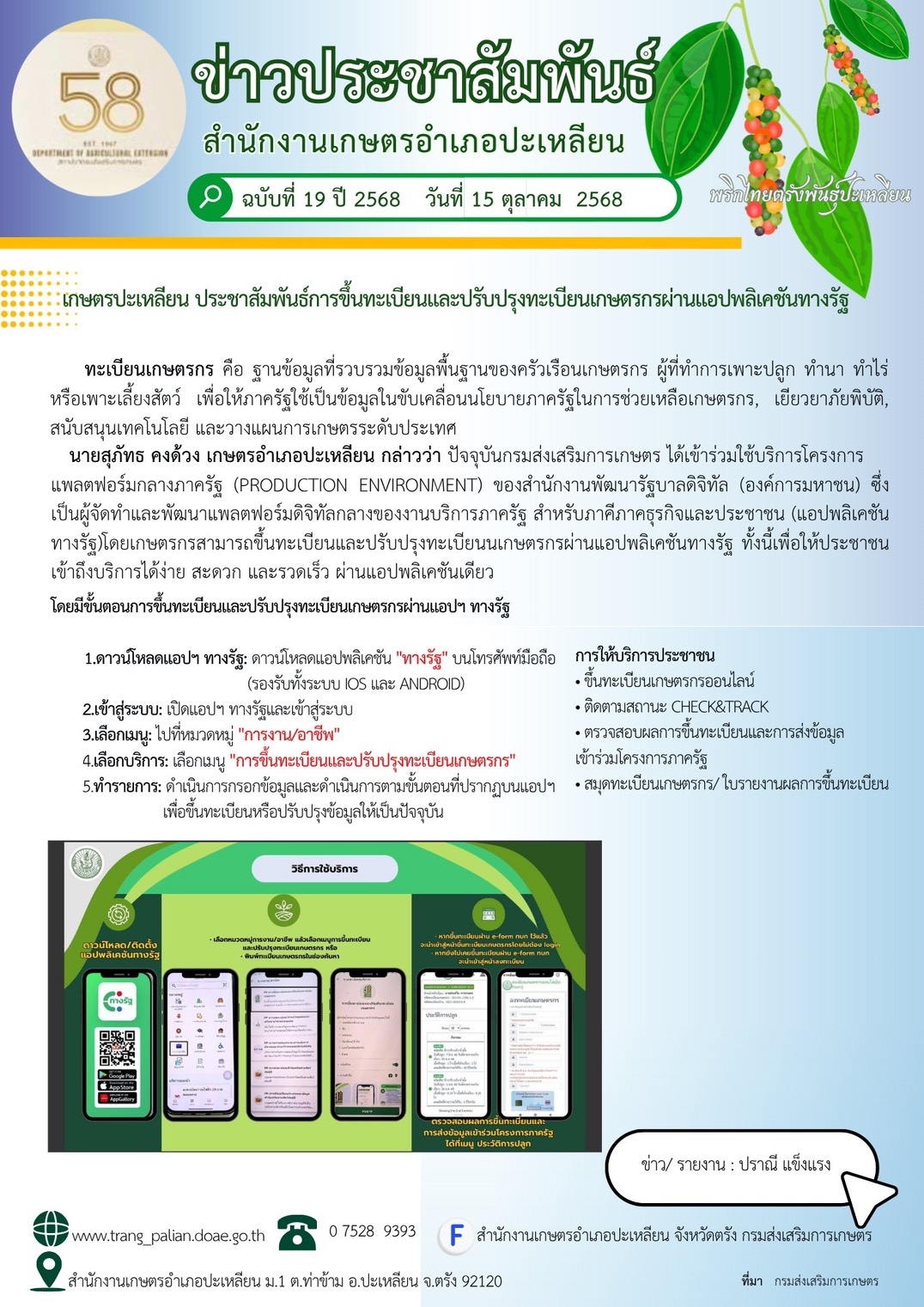 นายสุภัทธ คงด้วง เกษตรอำเภอปะเหลียน กล่าวว่า ปัจจุบันกรมส่งเสริมการเกษตร ได้เข้าร่วมใช้บริการโครงการ