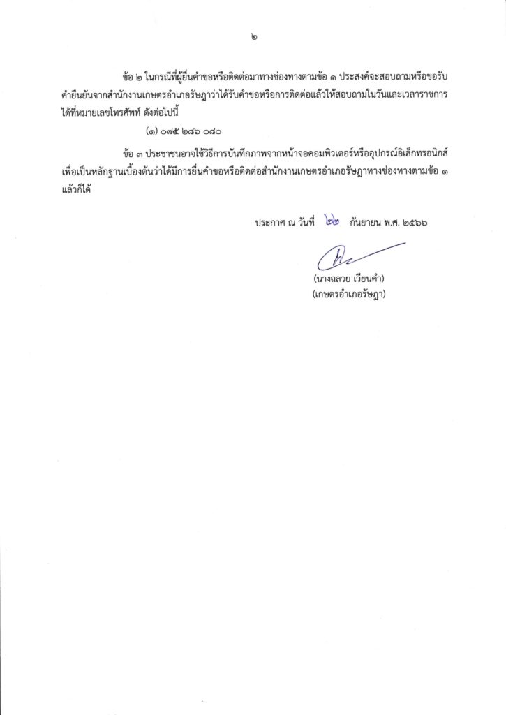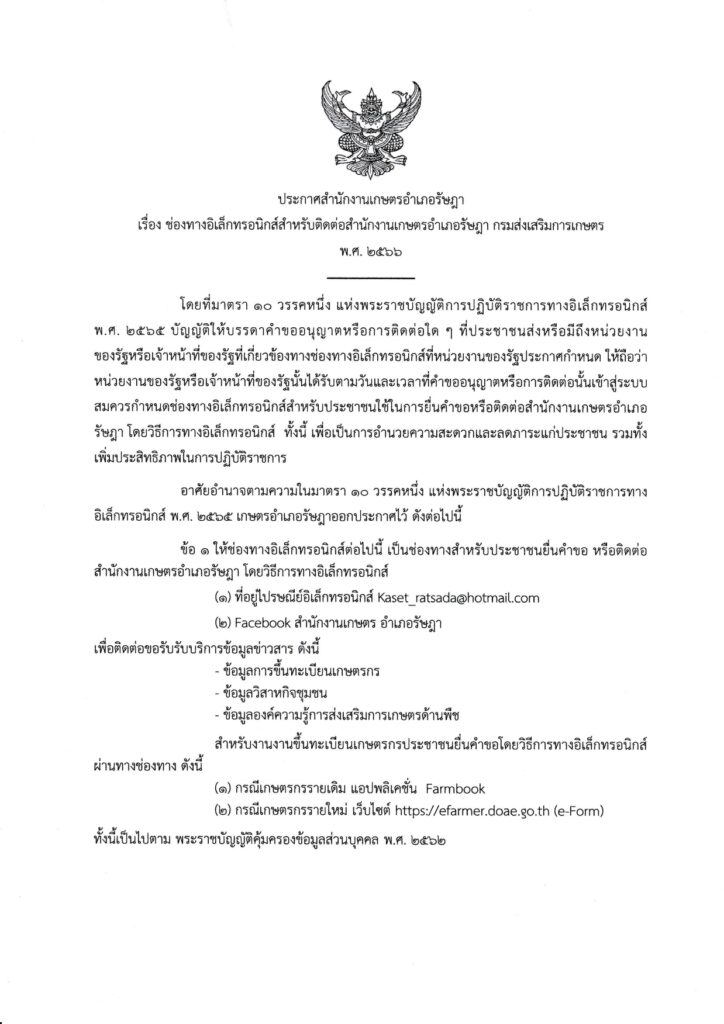 ประกาศ/คำสั่งพระราชบัญญัติการปฏิบัติราชการทางอิเล็กทรอนิกส์ พ.ศ. 2565 สำนักงานเกษตรจังหวัดตรัง ประกาศสำนักงานเกษตรจังหวัดตรัง เรื่อง ช่องทางอิเล็กทรอนิกส์สำหรับติดต่อสำนักงานเกษตรอำเภอรัษฎา พ.ศ. 2566