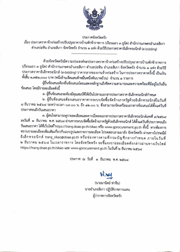 ประกาศจังหวัดตรัง เรื่อง ประกวดราคาจ้างก่อสร้างปรับปรุงอาคารบ้านพักข้าราชการ (เรือนแถว 3 ยูนิต) สำนักงานเกษตรอำเภอสิเกาBy admin_doae / 1 ธันวาคม 2025