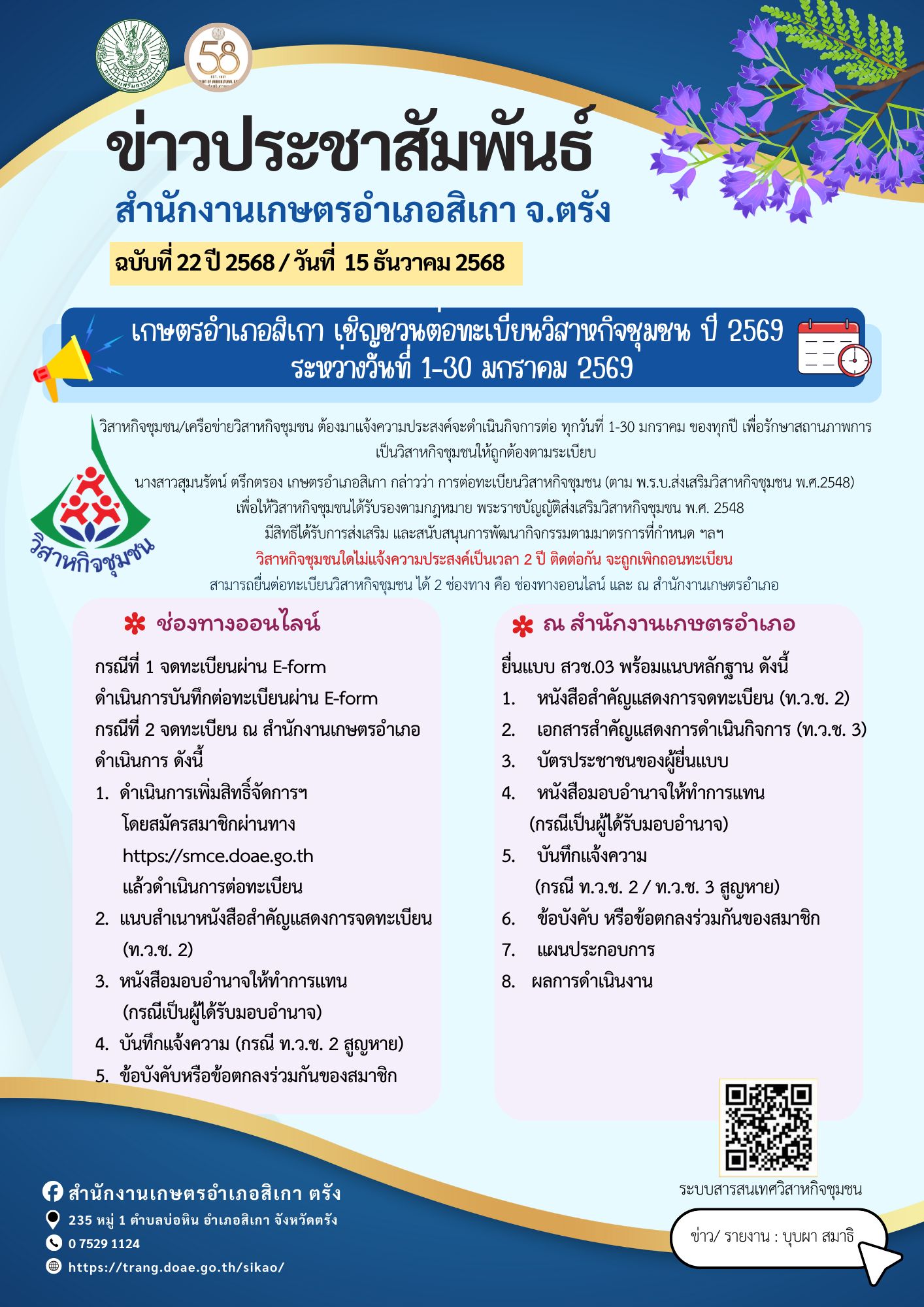 เกษตรอำเภอสิเกา เชิญชวนต่อทะเบียนวิสาหกิจชุมชน ปี 2569By admin_doae / 15 ธันวาคม 2025 ดาวน์โหลดแบบฟอร์มเอกสาร คลิกที่นี่
