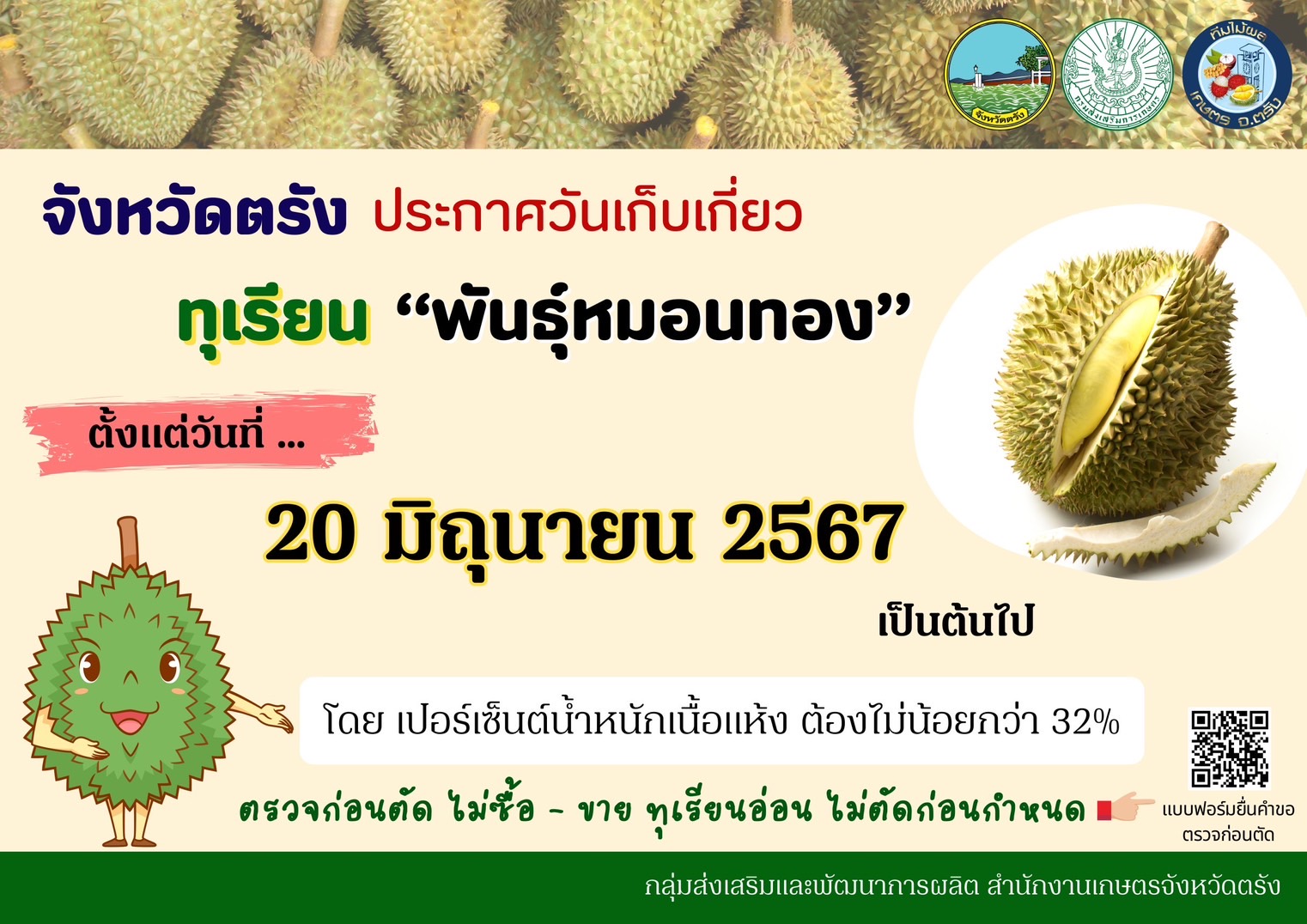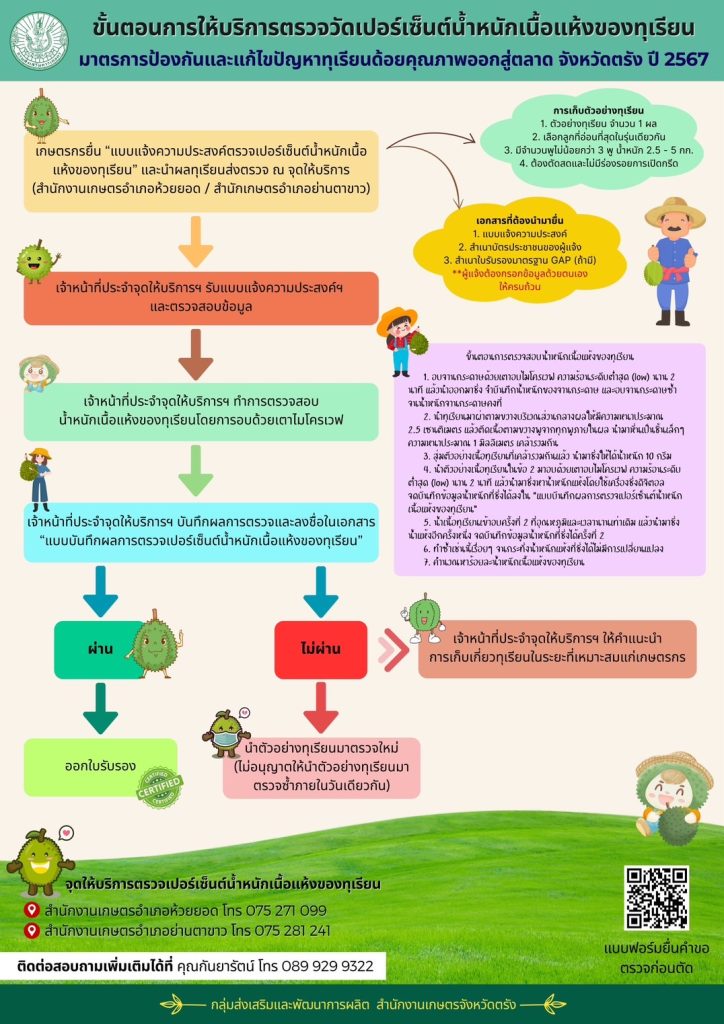 ประชาสัมพันธ์ ขั้นตอนการให้บริการตรวจวัดเปอร์เซ็นต์น้ำหนักแห้งของทุเรียน มาตรการป้องกันและแก้ไขปัญหาทุเรียนด้อยคุณภาพออกสู่ตลาด จังหวัดตรัง ปี 2567