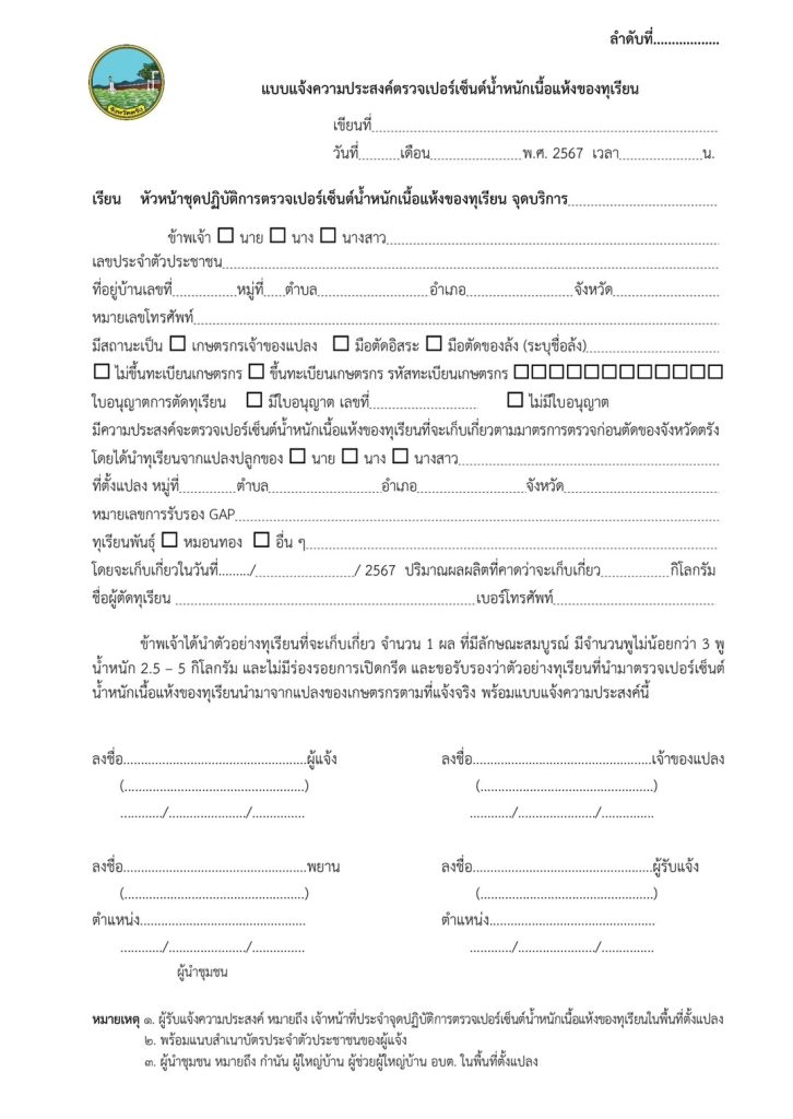 4. เจ้าหน้าที่ประจำจุดให้บริการฯ บันทึกผลการตรวจและลงชื่อในเอกสาร “แบบบันทึกผลการตรวจเปอร์เซ็นต์น้ำหนักแห้งของทุเรียน”