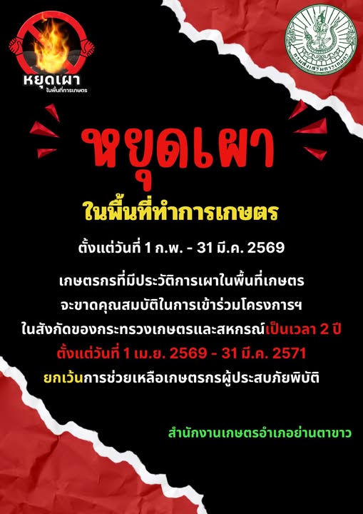 ข่าวประชาสัมพันธ์มาตรการหยุดเผาในพื้นที่เกษตร yantakhao_admin / 6 กุมภาพันธ์ 2026 ตั้งแต่วันที่ 1 ก.พ.